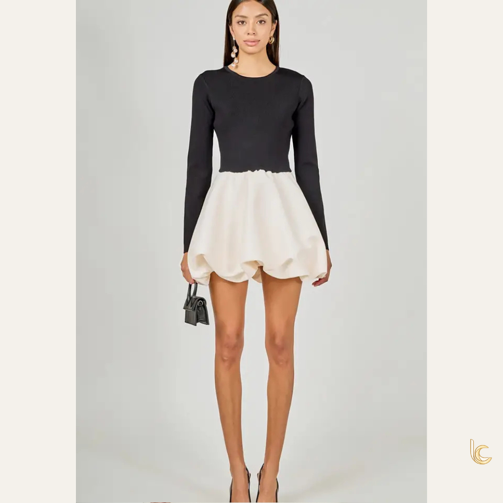 The voluminous bubble skirt adds a playful and feminine shape, while the soft knit bodice offers a flattering and comfortable fit. Whether you're dressing for a date night, cocktail party, special event, or evening out, this statement mini dress delivers effortless confidence and modern style.